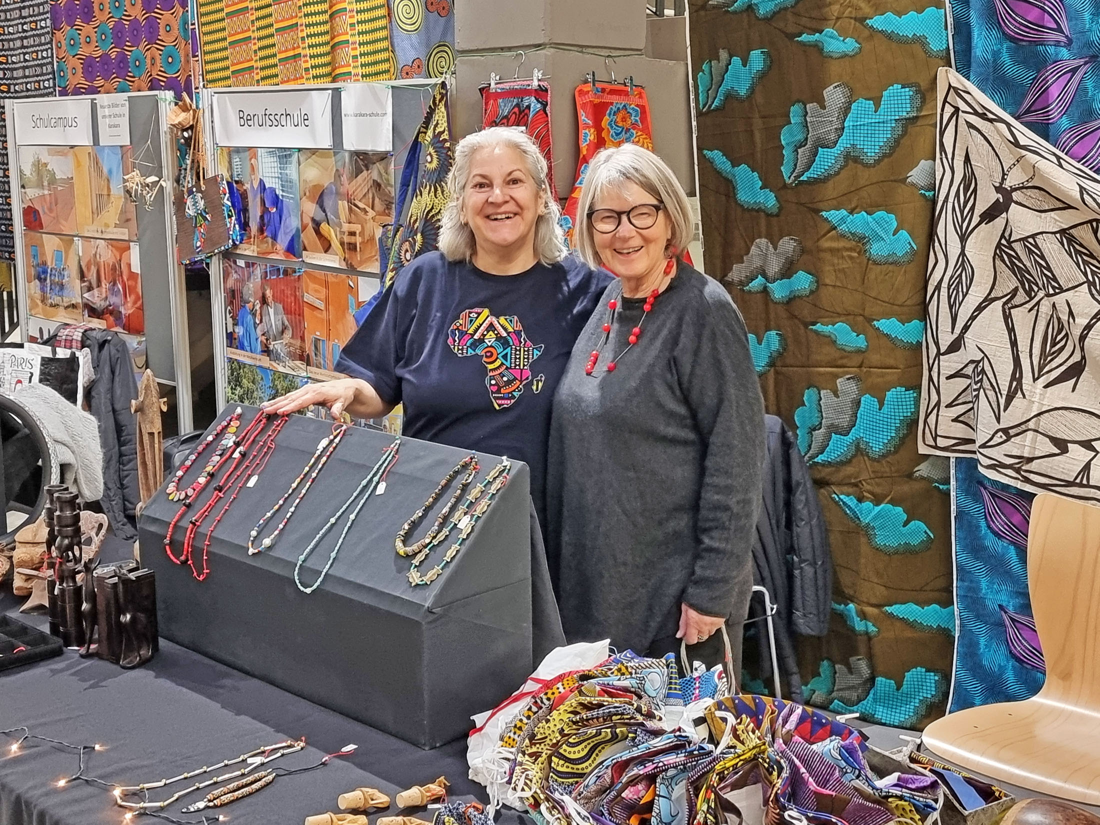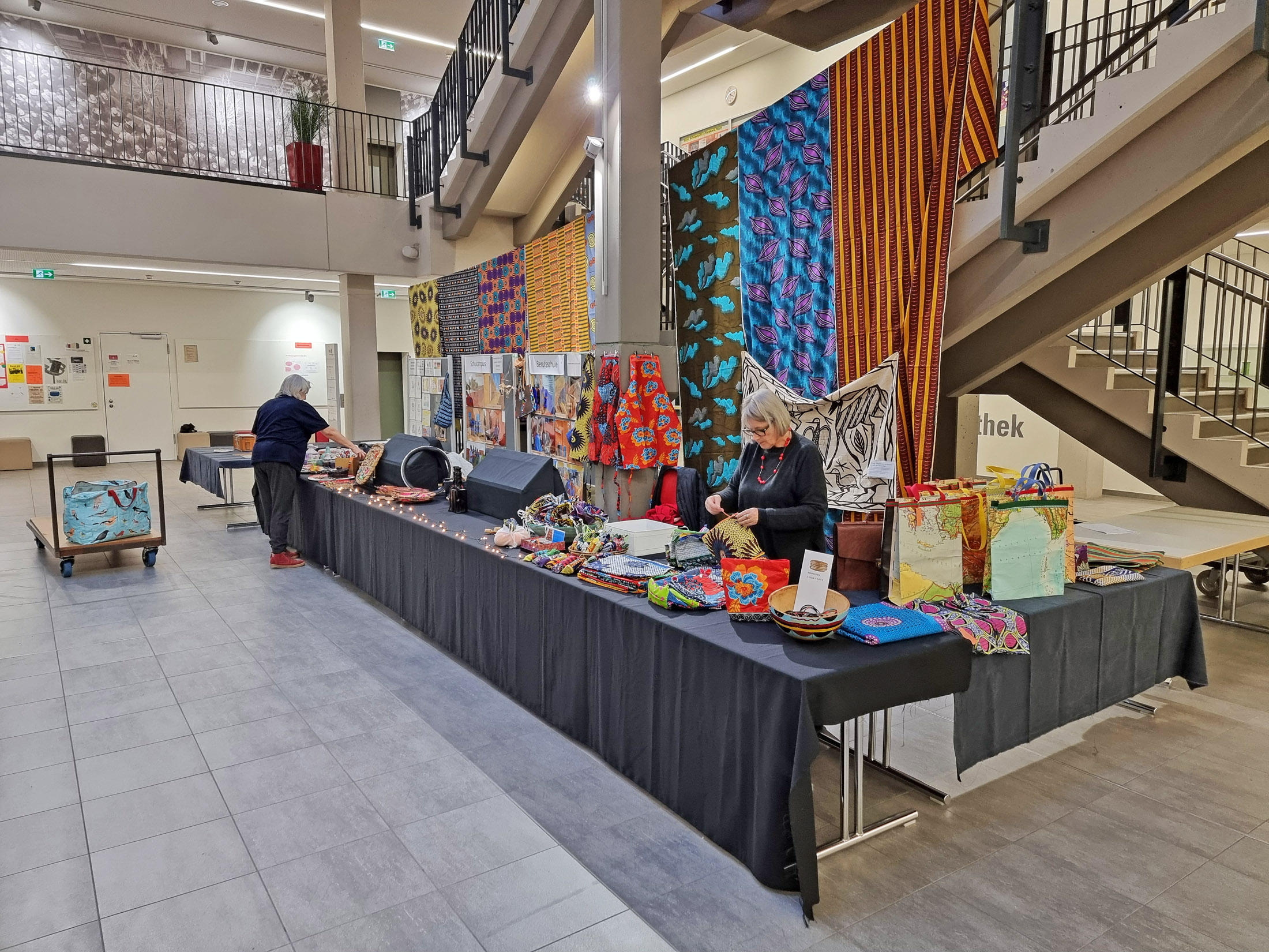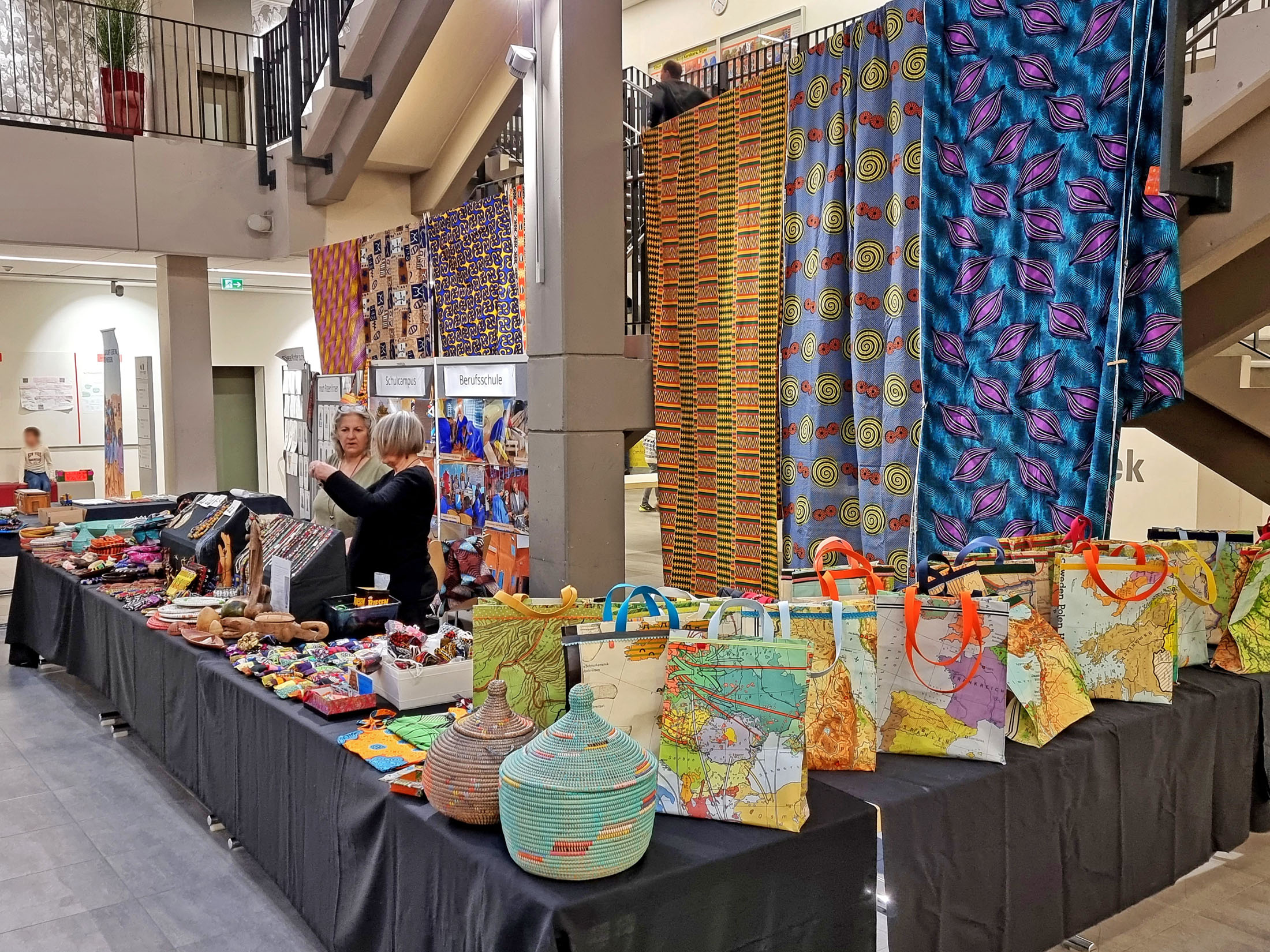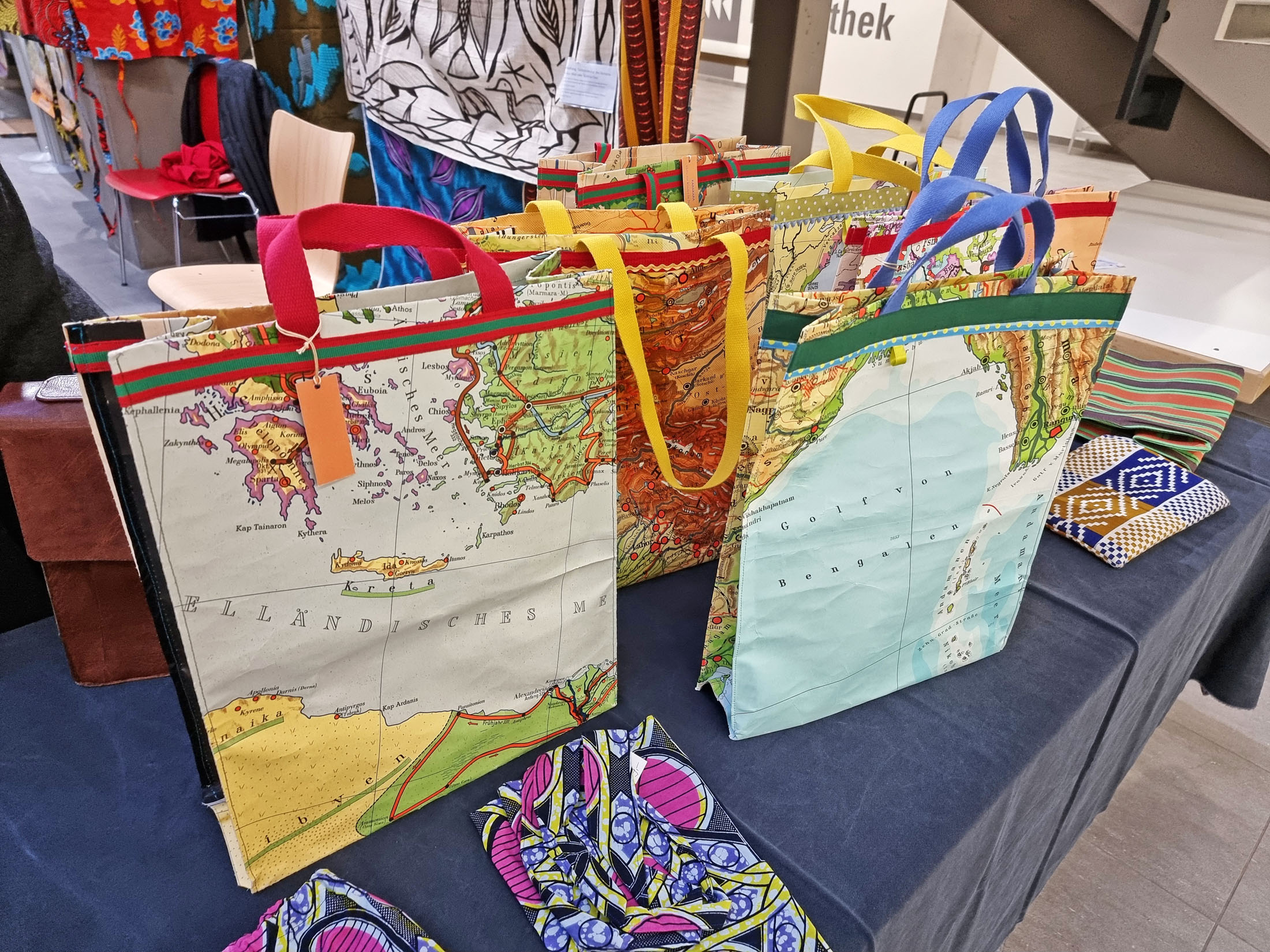 Am „Afrika-Stand“ gibt es Stoffe, Schmuck, Kleidung und allerlei Kunsthandwerkliches aus Niger zu erwerben. Die Schriftführerin des KARAKARA-Vereins, Monika Neumann, näht während des Jahres auch verschiedene nützliche Dinge wie Schürzen, Kulturbeutel, Lavendelsäckchen oder – der große Renner in diesem Jahr: Tragetaschen aus dem Material von Landkarten, welche die Schule durch die Umstellung auf digitale Varianten nicht mehr benötigt.