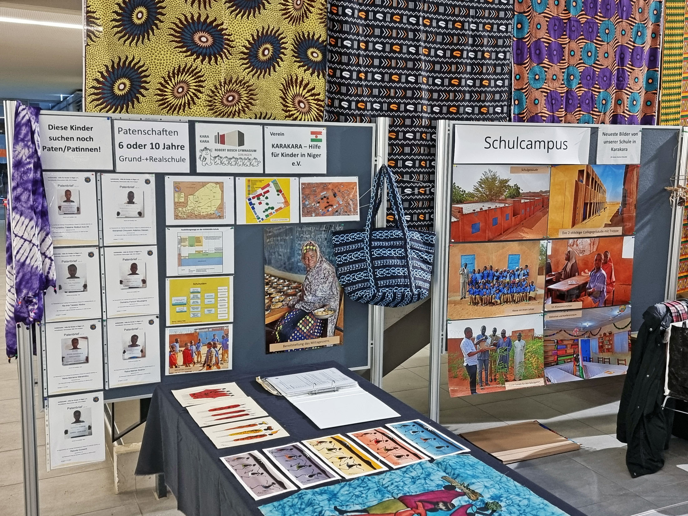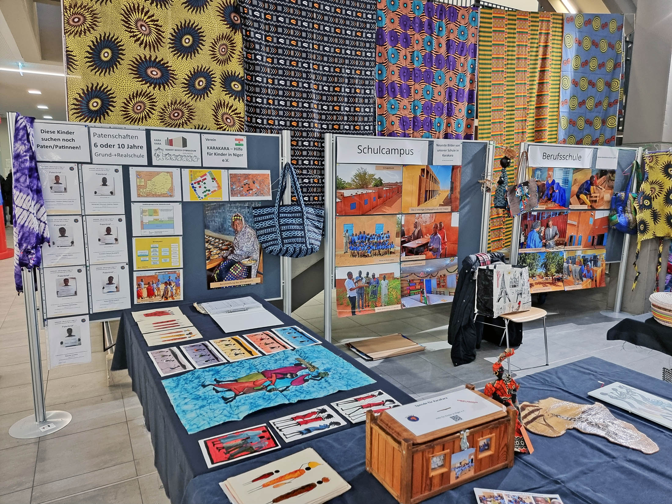 Mitglieder des KARAKARA-Vereinsvorstandes schlagen beim Basar im zentralen Atrium des Schulgebäudes stets einen Info-Stand und den „Afrika-Stand“ auf. Am Info-Stand können sich die Besucher/innen anhand ausliegender Flyer und der Aushänge an den Pinboards sowie im persönlichen Gespräch detailliert über das Projekt informieren, einen der Jahreskalender mitnehmen oder natürlich auch eine neue Patenschaft für ein noch nicht verpatetes Kind am Schulzentrum in Zinder abschließen. Immerhin 4 neue Patenschaften konnten beim diesjährigen Basar gewonnen werden.