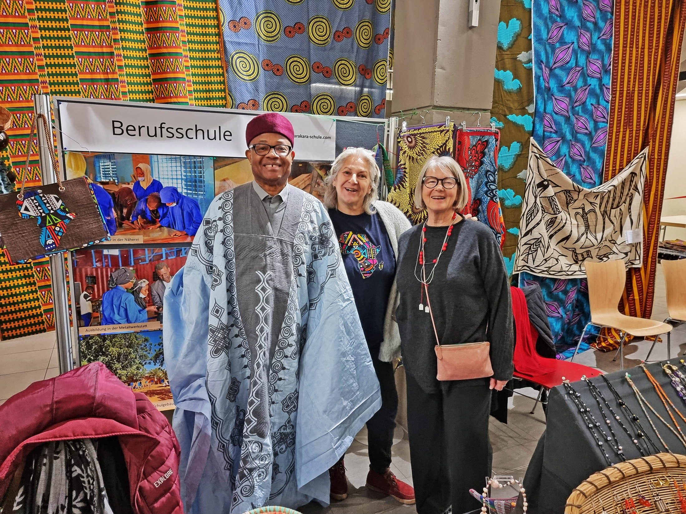 Bild oben: der Erste Vorsitzende des KARAKARA-Vereins, Lamin Ousman-Daouda, seine Frau Andrea und Schriftführerin Monika Neumann am Infostand.